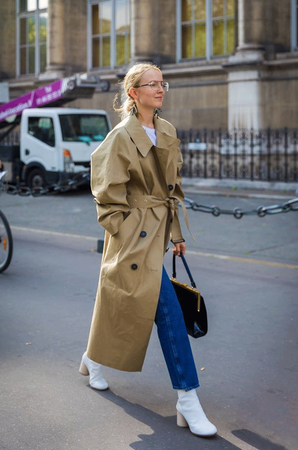 Mesmo que você escolha uma base básica para o look com o trench coat, aposte em uma bota branca para dar o contraste necessário à produção.